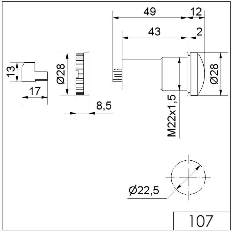 Ronfleur électronique EM pulsé; Tension: 24VAC/DC; Volume sonore: 80dB/10cm; Type de son: pulsé; Fréquence du son: env. 3200Hz; Raccordement: emboîtement avec raccordement à visser; Fixation: insertion; Diamètre: 28 mm; Couleur: noir; Catégorie de protection: IP65; Plage de température: -20°C...+50°C; Série: 107