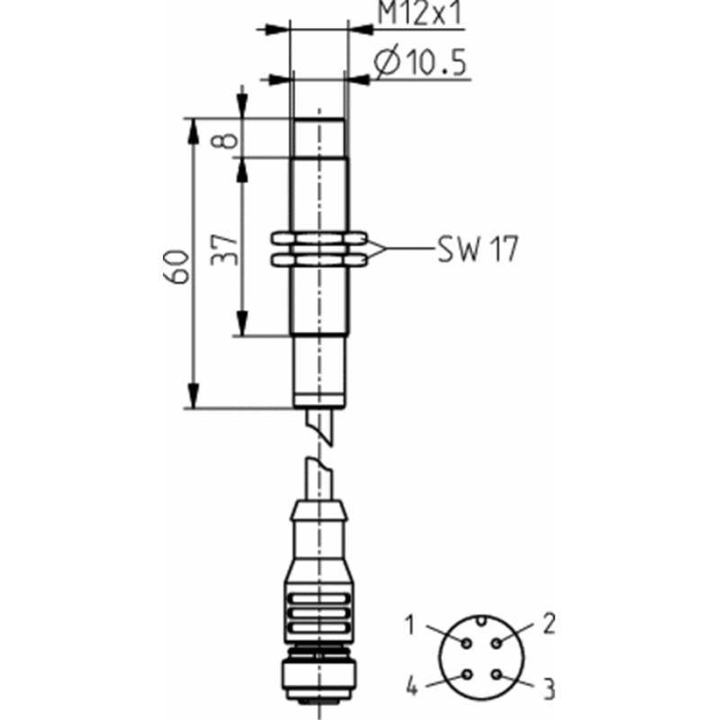 Capteur inductif sans fil; Format: Cylindrique fileté, M12 x 1; Version électrique: Sans fils; Distance de commutation Sn: 4 mm; Montage: Non noyable; Sortie de commutation: Voir RF 96 ST / RF I/O; Type de commutation: Voir RF 96 ST / RF I/O; Fréquence de commutation: Voir RF 96 ST / RF I/O; Actionneur: Plate d'acier 12 x 12 x 1 mm, FE 360; Mode de raccordement: Câble avec connecteur M12, 4 pôles, 0.5 m; Tension assigné d‘emploi Ue: 3 … 5 VDC; Diamètre: Ø 12 mm; Longueur totale du boîtier 60 mm; Longueur de filetage utile: 37 mm; Materiau du boîtier: Laiton nickelé; Etanchéité: IP 67 selon IEC EN 60529; Température ambiante: –25 °C … +70 °C; Compris dans la livraison: 2 écrous de fixation; Connectable à l'émetteur universel: RF 96 ST ou RF I/O (Ancien code-article: 90211005)