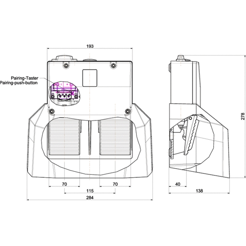 Pédale de commande sans fil; Protocole: sWave®; Fréquence: 2,4 - 2,4835 GHz; Energie d'émission: 1 mW; Alimentation: Pile lithium Tadiran SL-2770 (interchangeable); Rayon d'action: max. 20 m à l'intérieur; Boîtier: Fonte d’aluminium, revêtu par poudre; Pédale: Thermoplastique, renforcé en fibre de verre; Capot: Fonte d’aluminium, revêtu par poudre; Etanchéité: IP 67 selon CEI/EN 60529; Température ambiante: –20 °C … +65 °C; Certification:- Europe: RED 2014/53/EU- Etats-Unis: FCC - XK5-SW100AMBINT- Canada: IC - 5158A-SW100AMBINT; Série: RF GFS 2 SW2.4