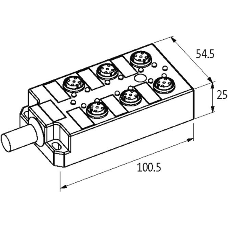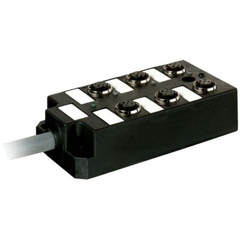 Répartiteur étanche ; Type: 6xM12, 5 pôles, câble préconfectionné, avec LED pour signaux PNP logiques ; Raccordement capteurs/actionneurs: 6 voies M12 femelle, 5 pôles, codé-A; Raccordement automate: Extrémité de câble libre; Câble: 3.0 m, PUR/PVC (UL/CSA), 15 fils (12x 0,34 mm²+3x 0,75 mm²), gris; Blindage: Non; Compatible chaînes porte-câbles: Oui (2 Mio.), 10 m/s²; Tension de service: 24 V DC (18 - 30 VCC); Courant de service max. par contact: 4 A; Courant total max.: 8 A; Dimensions (h x L x P): 125 mm x 50,2 mm x 17 mm; Matériau boîtier: PBT; Indice de protection: IP67, IP65 (EN CEI 60529); Température de service: -20 °C ... 80 °C; Température de service (statique): -30 °C ... 80 °C; Température de service (dynamique): -5 °C ... 70 °C; Température de service (chaîne d'entraînement): -5 °C ... 60 °C; Série: M12