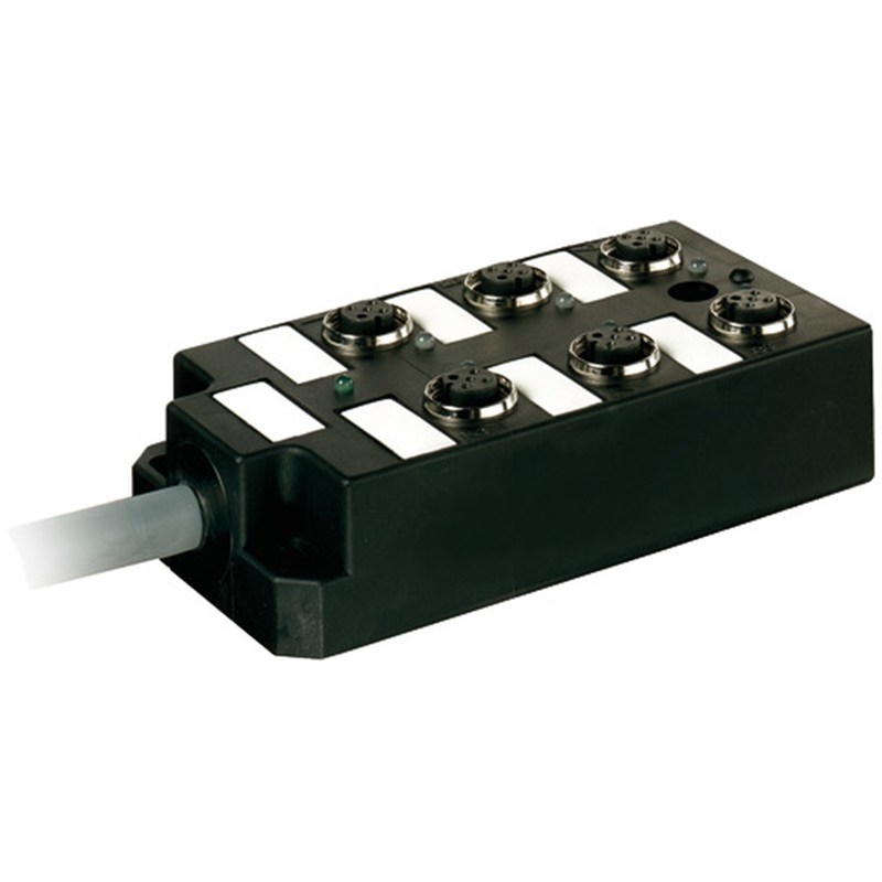 Répartiteur étanche ; Type: 6xM12, 5 pôles, câble préconfectionné, avec LED pour signaux PNP logiques ; Raccordement capteurs/actionneurs: 6 voies M12 femelle, 5 pôles, codé-A; Raccordement automate: Extrémité de câble libre; Câble: 15.0 m, PUR/PVC (UL/CSA), 15 fils (12x 0,34 mm²+3x 0,75 mm²), gris; Blindage: Non; Compatible chaînes porte-câbles: Oui (2 Mio.), 10 m/s²; Tension de service: 24 V DC (18 - 30 VCC); Courant de service max. par contact: 4 A; Courant total max.: 8 A; Dimensions (h x L x P): 125 mm x 50,2 mm x 17 mm; Matériau boîtier: PBT; Indice de protection: IP67, IP65 (EN CEI 60529); Température de service: -20 °C ... 80 °C; Température de service (statique): -30 °C ... 80 °C; Température de service (dynamique): -5 °C ... 70 °C; Température de service (chaîne d'entraînement): -5 °C ... 60 °C; Série: M12