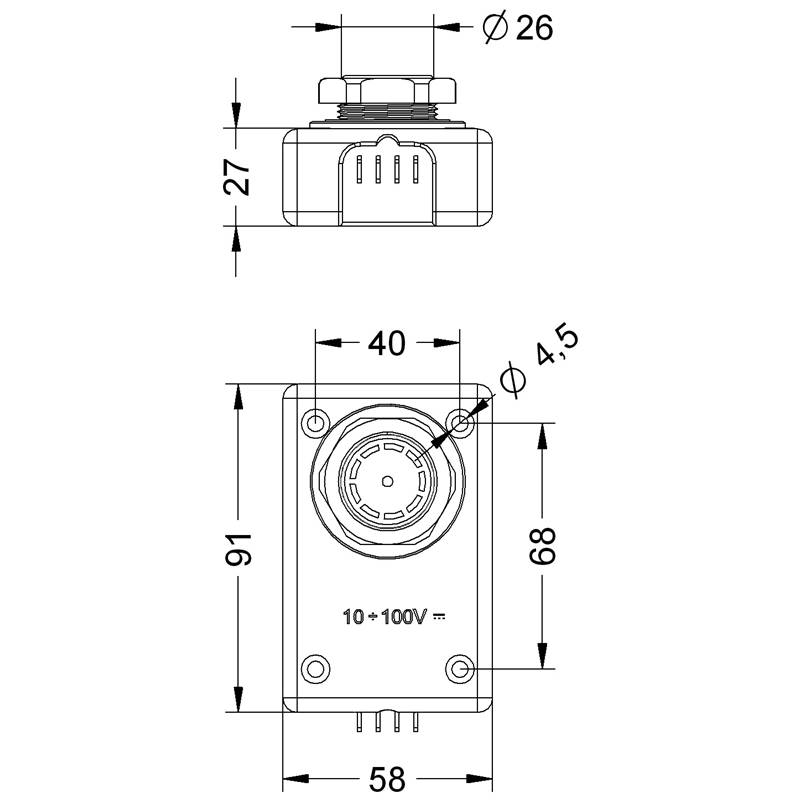Alarme de recul; Type de sons: Continu, Intermittent; Puissance sonore: 95 dB(A)1m au niveau standard ou 85 dB(A)1m en puissance réduite; Fréquence: 2400Hz +/-100; Tension d'utilisation: 10-100V DC; Fixation: par vis (M4) ou par collier frontal; Boîtier: PA6+FG; Couleur de la base: Noir; Degré de protection: IP65; Température de fonctionement: -30 ... +50 °C