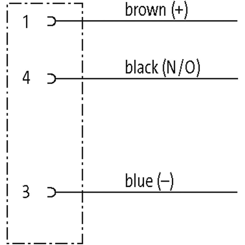 Connecteur / Câble de raccordement; Type: Câble de connexion, M8 x 1; surmoulé, Raccordement A: Connecteur M8, femelle, droit, 3 pôles; Raccordement B: Extrémité de câble libre; Câble: 10.00 m, PUR (UL/CSA), 3 fils (3 x 0.25 mm²), noir; Blindage: Non blindé; Compatible chaînes porte-câbles: Oui (10 Mio.), 10 m/s²; Tension de service: max. 50 V AC/60 V DC; Courant de service par contact: max. 4 A; Degré de protection: IP65, IP66K, IP67 (Selon EN 60529); Plage de températures (fixe): -40...+80 °C; Plage de températures (mobile): -25...+80 °C; Résistance chimique: Bonne résistance à l'huile, à l'essence et aux produits chimiques
