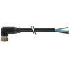 Connecteur / Câble de raccordement; Type: Câble de connexion, M8 x 1, surmoulé; Raccordement A: Connecteur M8, femelle, coudé, 4 pôles, codé-A; Raccordement B: Extrémité de câble libre; Câble: 5.00 m, PVC (UL/CSA), 4 fils (4 x 0,25 mm²), noir; Blindage: Non blindé; Compatible chaines portes-câbles: Non; Tension de service: max. 50 V AC/60 V DC; Courant de service par contact: max. 4 A; Degré de protection: IP65, IP66K, IP67 (EN 60529); Plage de températures (fixe): -30...+80 °C; Plage de températures (mobile): -5...+80 °C