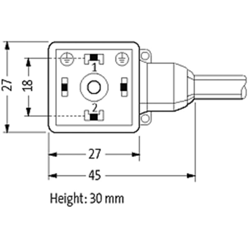 Connecteur pour électrovannes / Câble de raccordement; Type: Forme A 18mm, avec LED et antiparasitage; Raccordement A: Connecteur forme A 18 mm, noir; Raccordement B: Extrémité de câble libre; Câble: 2.00 m, PVC, 3 fils (3 x 0,75 mm²), gris; Brochage: 2 contacts + terre pontée; Blindage: Non blindé; Compatible chaînes porte-câbles: Non; Coffret: Plastique, gris; Indicateur à LED: Jaune; Antipasitage supplémentaire: Diode/Diode zener; Tension de service: 24 V AC ±20% / DC ±25%; Courant de service par contact: max. 4 A; Degré de protection: IP67 (selon EN 60529); Plage de températures (fixe): -30...+70 °C; Plage de températures (mobile): -5...+70 °C; Série: MSUD