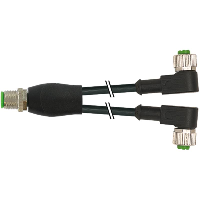Câble de liaison en Y; Connecteur M12-A mâle droit 4 pôles/2x Connecteurs M12-A femelle coudé; Câble PUR 3x0,34 Noir 1,5m