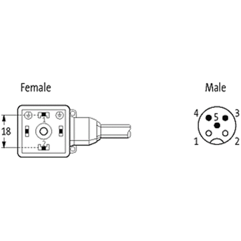Connecteur pour électrovannes / Câble de raccordement; Type: Câble de connexion, avec LED et antiparasitage; Raccordement A: Connecteur forme A 18 mm, noir; Raccordement B: Connecteur M12, mâle, droit, 3 pôles, codé-A; Câble: 4.00 m, PUR/PVC, 3 fils (3 x 0,75 mm²), gris; Brochage: 2 contacts + terre pontée; Blindage: Non blindé; Compatible chaînes porte-câbles: Oui (2 Mio.), 5m/s²; Tension de service: 24 V AC ±20% / DC ±25%; Courant de service par contact: max. 4 A; Indicateur à LED: Jaune; Antiparastage: Diode Zener; Degré de protection: IP67 lorsqu'enfiché et vissé (EN 60529); Plage de températures (fixe): -30...+80 °C; Plage de températures (mobile): -5...+80 °C