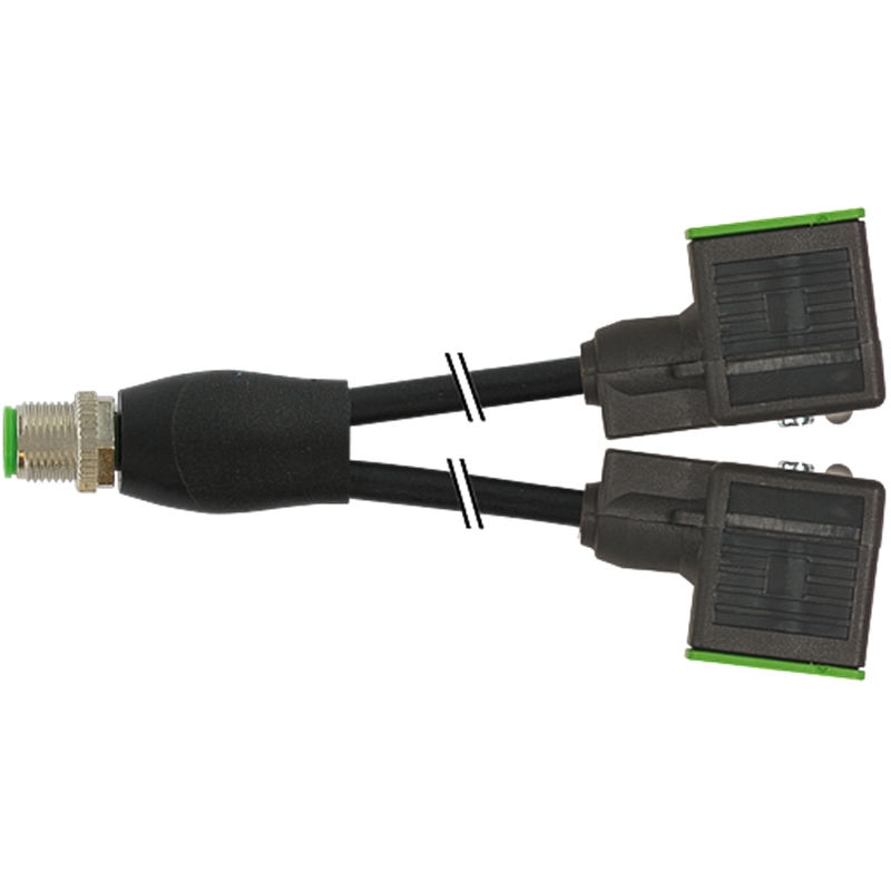 Câble de connexion, en Y; Connecteur M12-A mâle droit 4 pôles/2x Connecteurs pour électrovannes Forme BI 11mm LED+ATP; Câble PVC 3x0,75 Noir 1m
