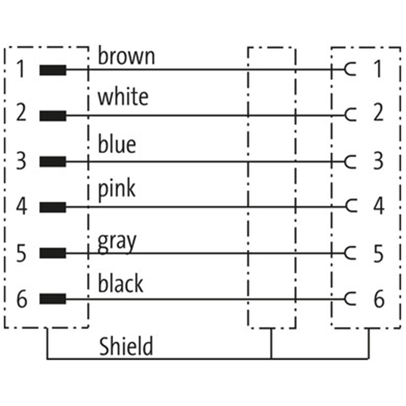 Connecteur / Câble de raccordement; Type: Câble de connexion, M12 x 1 / M12 x 1; Raccordement A: Connecteur M12 femelle, droit, 6 pôles; Raccordement B: Connecteur M12 mâle, droit, 6 pôles; Câble: 20.00 m, PUR, 6 fils (4×0.5 + 2×0.25 mm²), vert; Blindage: Blindé; Compatible chaînes porte-câbles: Oui (2 Mio.); Tension de service: max. 50 V AC/60 V DC; Courant de service par contact: max. 4 A; Degré de protection: IP66K, IP67 (EN 60529); Plage de températures (fixe): -30...+80 °C; Plage de températures (mobile): -5...+80 °C