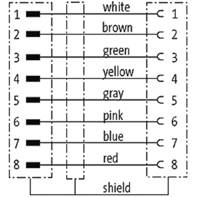 Connecteur / Câble de raccordement; Type: Câble de connexion, M12 x 1 / M12 x 1; Raccordement A: Connecteur M12, femelle, droit, 8 pôles, codé-A; Raccordement B: Connecteur M12, mâle, droit, 8 pôles, codé-A; Câble: 2.00 m, PUR (UL/CSA), 8 fils (8 x 0,25 mm²), gris; Blindage: Blindé; Compatible chaînes porte-câbles: Oui (5 Mio.), 5 m/s²; Tension de service: max. 30 V AC/DC; Courant de service par contact: max. 2 A; Degré de protection: IP65, IP66K, IP67 (EN 60529); Plage de températures (fixe): -40...+80 °C; Plage de températures (mobile): -25...+80 °C