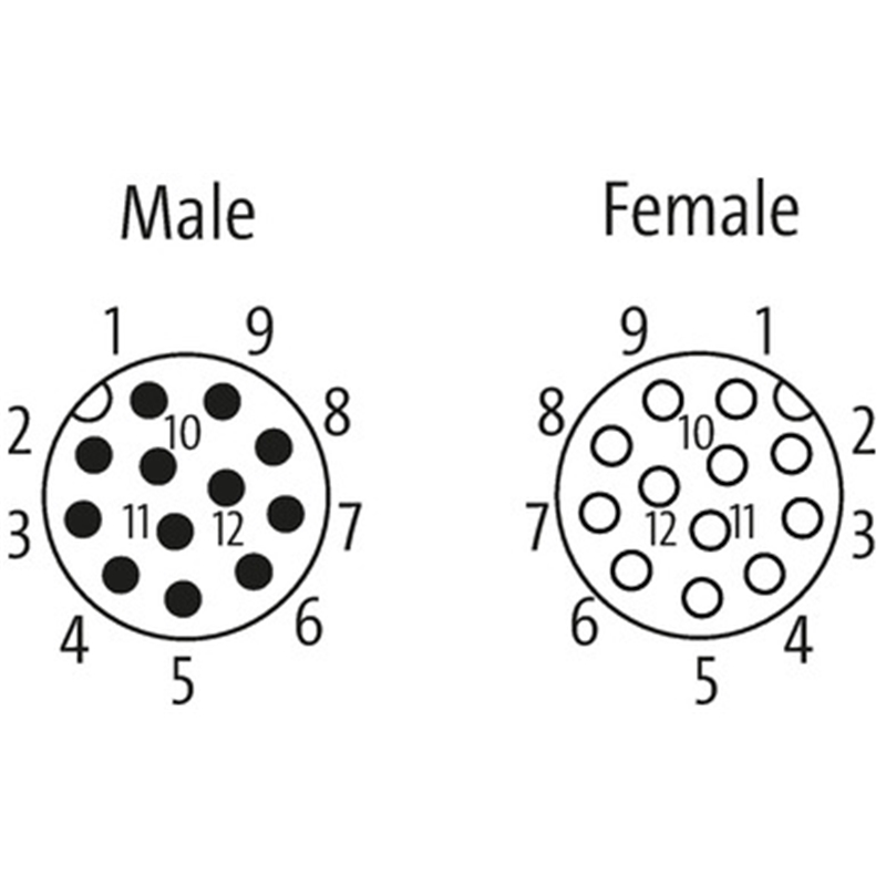 Câble de connexion; Connecteur M12-A femelle 0° 12 pôles/Connecteur M12-A mâle 0° 12 pôles; Blindé PUR 12x0.14 Noir Compatible chaines porte-câbles 10m