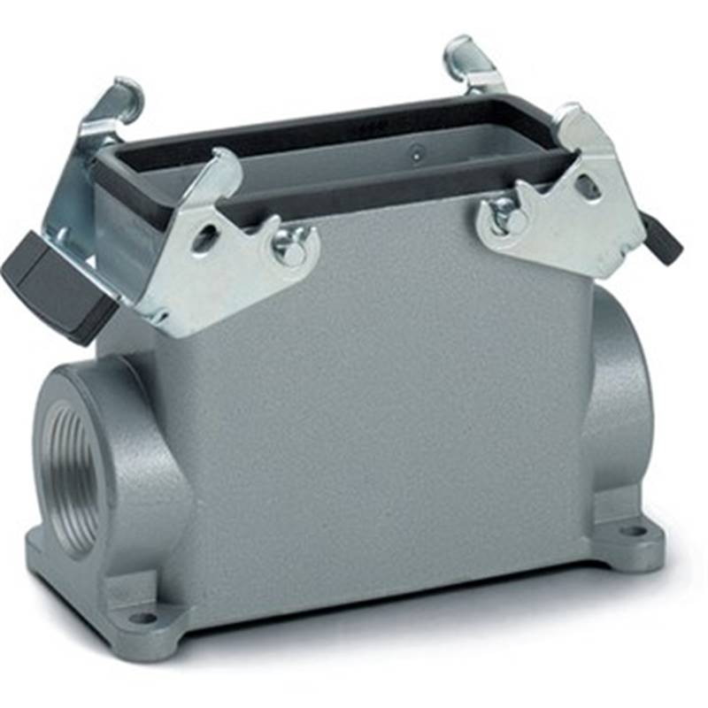 Boîtier H-B: embase en saillie (2 entrées de câble, double levier, version haute); Taille: 24B; Col: Oui; Matériau:- Boîtier: Alliage en aluminium recouvert par pulvérisation, gris (RAL 9006)- Levier: Acier zingué- Joint: NBR; Nombre d'entrées de câble: 2 (PG 29); Type du mécanisme de verrouillage: Double levier; Indice de protection: IP 65 (verrouillé); Plage de température: -40°C à + 110°C, pointe +125°C; Homologations-Normes: CE / cRUus / Testé VDE; Pièces / conditionnement: 5; Série: EPIC® H-B 24 SGRLH