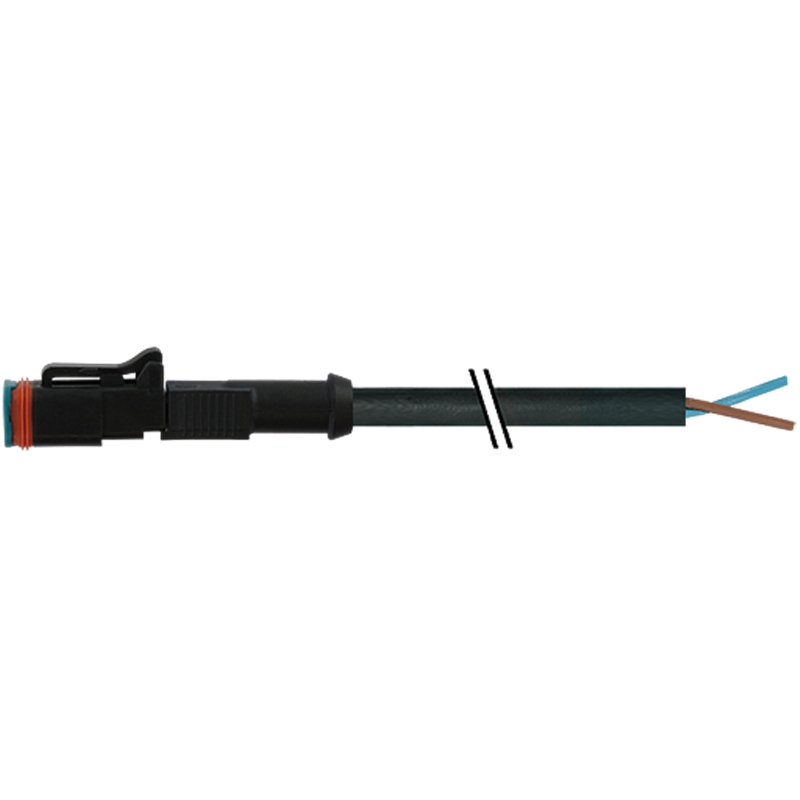 Connecteur / Câble de raccordement; Type: Connecteur pour électrovannes; MDC06-2s pour hydraulique mobile; Raccordement A: Connecteur pour électrovannes; MDC06-2s, mâle, droit; Raccordement B: Extrémité de câble libre; Câble: 1.5 m, PUR (UL/CSA), 2 fils (2 x 0,75 mm²), noir; Compatible chaînes porte-câbles: Oui (5 Mio.), max. 10 m/s²; Tension admissible: 12...230 V AC/DC, sans composants; Courant de service par contact: max. 4 A; Degré de protection: IP68 lorsqu'enfiché et verrouillé (EN 60529); Plage de températures (fixe): -40...+80 °C; Plage de températures (mobile): -25...+80 °C; Compatible: Avec Deutsch DT06-2S