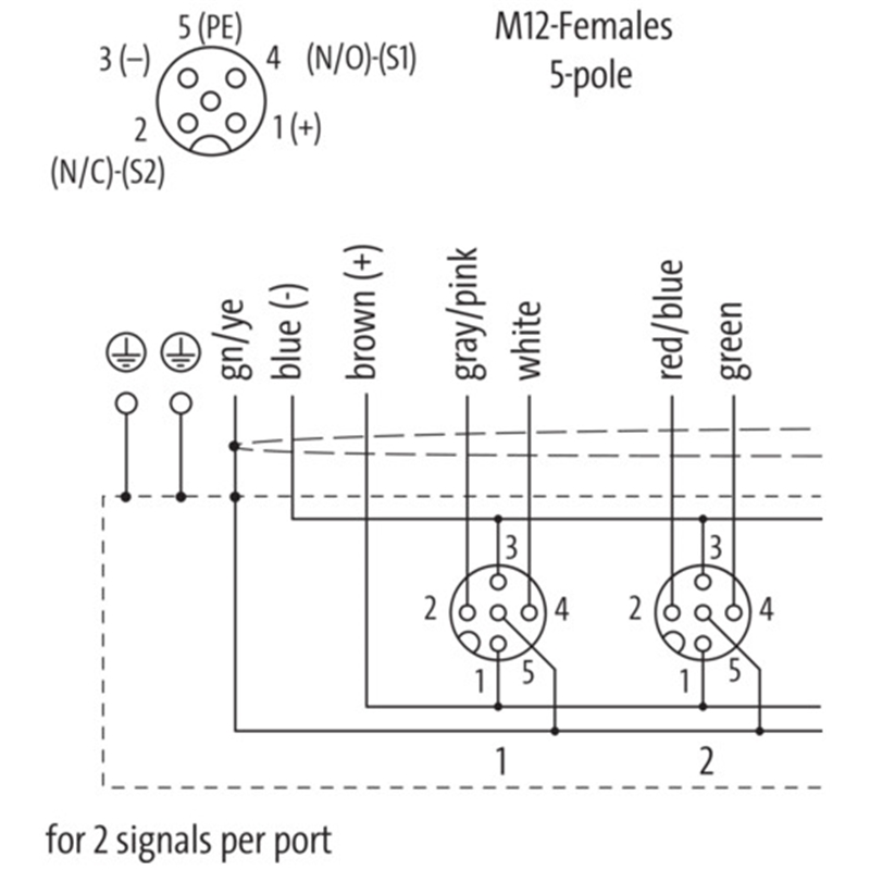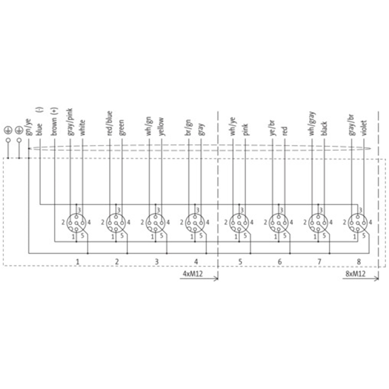 Répartiteur MVP12 Métal, 8x M12, 5 pôles, avec câble fixe 10.0m PUR 16x0,34+3X0.75, UL/CSA