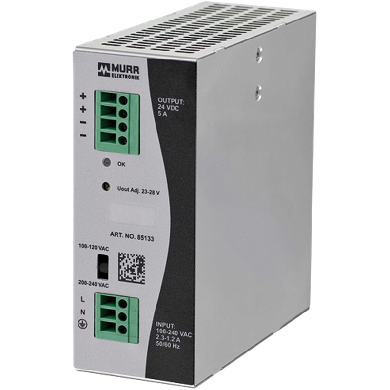 Alimentation à découpage; Type: 1 phase; Tension d’entrée: 100...240 V AC; Courant d’entrée: 2.4 A (100 V AC); 1.2 A (240 V AC); Fréquence: 50...60 Hz; Tension de sortie: 24 V DC ±1%; réglable 23...28 V; Courant de sortie: 5 A (+40 °C); 4 A (+55 °C); Type de raccordement: Bornes à vis; Mode de fixation: A enclipser sur rail DIN TH35 (EN 60715); Dimensions (H x L x P): 125 mm x 50 mm x 123 mm; Degré de protection: IP20; Plage de température: 0...+40 °C, ...+55 °C derating (temp. de stockage -20...+85 °C); Série: Eco-Rail-2