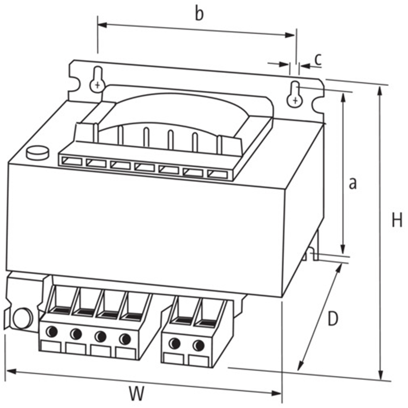 Transformateur monophasé de commande et d’isolement; Puissance nominale: 800 VA; Tension d’entrée: 400 VAC +/- 5%; Fréquence: 50...60 Hz; Tension de sortie: 230 VAC; Classe d’isolement: T 60/B; Mode de raccordement: Bornes à vis; Dimensions (H x L x P): 118 x 175 x 160 mm; Cotes de fixation (a x b x c): 92 x 135 x 7 mm ; Ø perçage: 7 x 11 mm; Mode de fixation: Fixation par trou de serrure; Degré de protection: IP20; Plage de température: -20...+60 °C; Série: MET