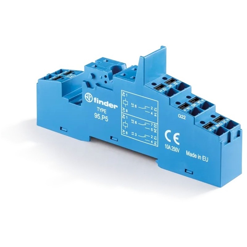 Support 10A 250V, température ambiante -40° à 70°C, séries 4051, 4052 et 4061, bleu, raccordement bobine et contacts séparés, étrier métal, bornes Push-in, montage sur panneau ou rail 35mm