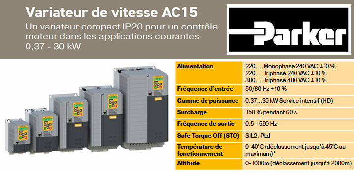 Variateur de fréquence AC, série AC15, 3PH, 400V, 0.37kW, 1.2A, Filtre C3, Fr, Taille 1 Variateur de fréquence AC; Version: Triphasée; Tension d'entrée: 3*400/480VAC; Fréquence d'entrée: 50/60 Hz ±10 % ...