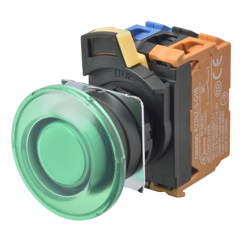 Bouton poussoir A22NL Ø22, lentille plastique, Champignon, Momentané, Couleur bouton Vert transparent, DEL Verte, 1NO 1NF, 200-240 VAC