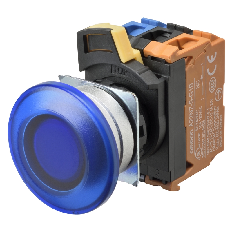Bouton-poussoir A22NL Ø22, lentille Métal brossé métal, Champignon, Momentané, Couleur bouton Bleu transparent, DEL Bleue, 2NF, 100-120 VAC