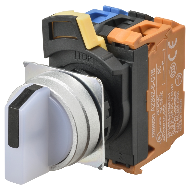 Bouton-poussoir A22NW Ø22, 3 positions, Lumineux, lentille Métal brossé, AUTO RESET ON Gauche, Couleur Blanc, DEL Jaune, 2NO, 100-120 VAC