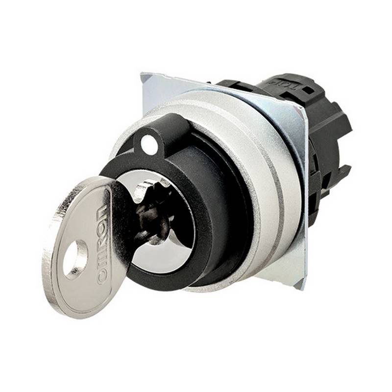 Sélecteur A22NZ Ø22mm, Type à clés, 3 positions, AUTO RESET ON Gauche, A relâchement position centée, Colerette aluminium brossé