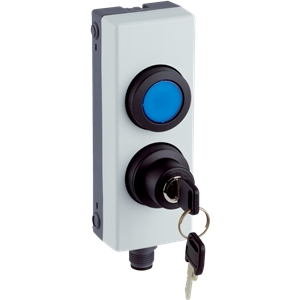 Appareil de commande de sécurité; Type d'interrupteur: Bouton-poussoir double touche; Nombre de contacts NO: 2; Raccordement: Connecteur mâle M12, 8 pôles; Convient aux applications d'inhibition (muting) (avec UE403): non; Convient aux applications de réinitialisation/dégagement (avec deTec4):...