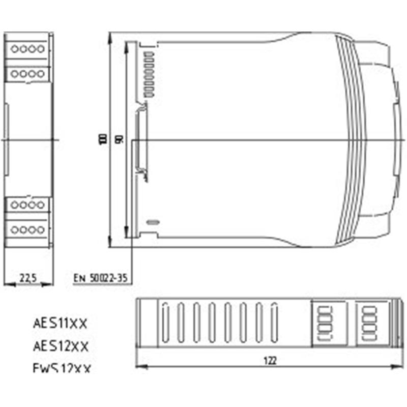 Relais de sécurité; Utilisation: Surveillance de dispositifs de commutation électromécaniques et optoélectroniques; Fonction de réarmement automatique: Oui; Test au démarrage: Oui; Nombre de contacts NF: 2; Nombre de contacts NO: 1; Nbre de sorties statiques non temporisées avec fonct. de signalisation: 2; Nombre de contacts de sécurité: 1; Nombre de sorties de signalisation: 2; Raccordement: Bornes à vis 0,25 - 2,5 mm²; Tension d'alimentation: 24 VAC/DC; Dimensions (L x H x P): 22,5 mm x 100 mm x 121 mm; Température ambiante: +0 ... +55 °C; Série: AES