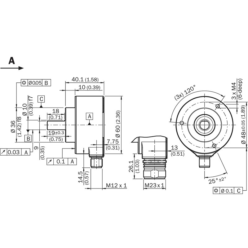 Codeur absolu; Version du codeur: Monotour; Nombre de pas max. par tour: 2.048 (11 bit); Interface mécanique: Arbre plein, bride de serrage; Diamètre de l'axe: 10 mm; Interface de communication: SSI, code Gray; Mode de raccordement: Connecteur M23, mâle, 12 pôles, radial; Tension d'alimentation: 4,5-32Vdc; Matériau, arbre: Acier inoxydable; Matériau, bride: Aluminium; Matériau, boîtier: Aluminium moulé sous pression; Indice de protection: IP65, côté arbre, IP67, côté boîtier (selon CEI 60529); Température de fonctionnement: –40 °C ... +100 °C; Série: AFS/AFM60 SSI