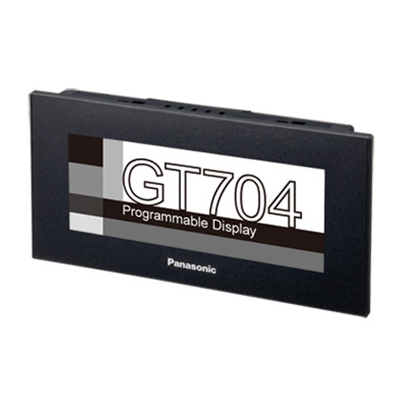 Écran tactile GT704 4.6"", 64 niveau de gris, 640x240 pix., Ethernet + RS232 + mini-USB (prog.), 24V DC, cadre noir, rétroéclairage LED : blanc, rouge, rose, emplacement pour carte SD