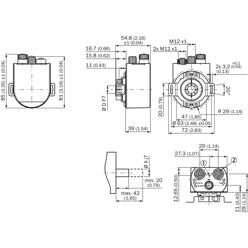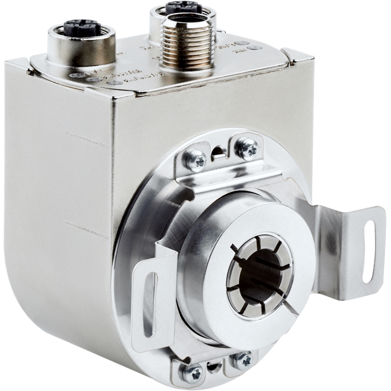 Codeur absolu; Version: Multitours; Nombre de pas par tour (résolution max.): 262.144 (18 bit); Nombre de tours: 65.536 (16 bit); Interface mécanique: Axe creux non traversant 8 mm (Bornes à l'avant); Type de bride / bras de couple: Support de couple bilatéral, cercle de trou 63 mm; Interface de communication: PROFINET; Raccordement: - Connecteur mâle, 1x, M12, 4 pôles, radial, - Connecteur femelle, 2x, M12, 4 pôles, radial; Tension d'alimentation: 10 ... 32 V; Matériau, arbre: Acier inoxydable; Matériau, bride: Aluminium; Matériau, bras de couple: Acier inoxydable; Matériau, boîtier: Zinc moulé sous pression avec revêtement cuivre-nickel; Indice de protection: IP65 (CEI 60529); Température de fonctionnement: –40 °C ... +85 °C; Série: ANS/ANM58