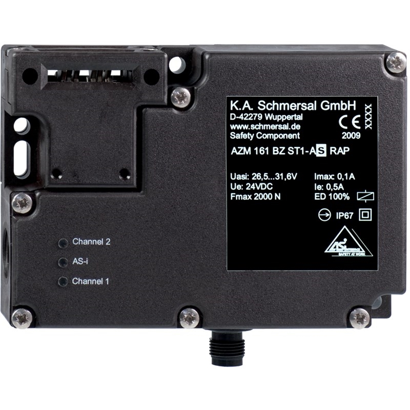 Dispositif d'interverrouillage AS-Interface; Codage selon EN ISO 14119 : Faible; Mode d’action : électromécanique; Ouverture hors tension : Oui; Surveillance de l’actionneur : Oui; Déverrouillage manuel : Oui; Force de retenue conforme à la norme EN ISO 14119 : 2 000 N; Force de retenue, max. : 2 600 N; Force de maintien : 5 N; Profil AS-i : Safety-esclave, V 2.1; Actionneur : Aucun; Raccordement : Connecteur mâle M12, 4 pôles, codé-A; Dimensions (L x l x H) : 30 mm x 130 mm x 90 mm; Matériau du boîtier : Plastique, thermoplastique renforcé de fibres de verre; Étanchéité : IP67; Température ambiante : -25 ... +60 °C; Série : AZM 161