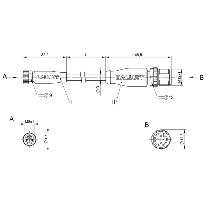 Connecteur / Câble de raccordement, Raccordement A: Connecteur M8x1, femelle, droit, 4 pôles, codé-A, Raccordement B: Connecteur M12x1 mâle, droit, 4 pôles, codé-A, Câble: PUR noir, 4.5 m, compatible chaînes porte-câbles, Nombre de conducteurs: 4, Température de câble, pose fixe: 50...90 °C, Température de câble, pose flexible: 25...90 °C, Tension d'emploi Ub: 60 VDC / 60 VAC, Courant nominal (40 °C): 4.0 A, Classe de protection: IP67, IP69K/IP67, IP68, IP69K, Homologation / conformité: CE, UKCA, cULus, WEEE