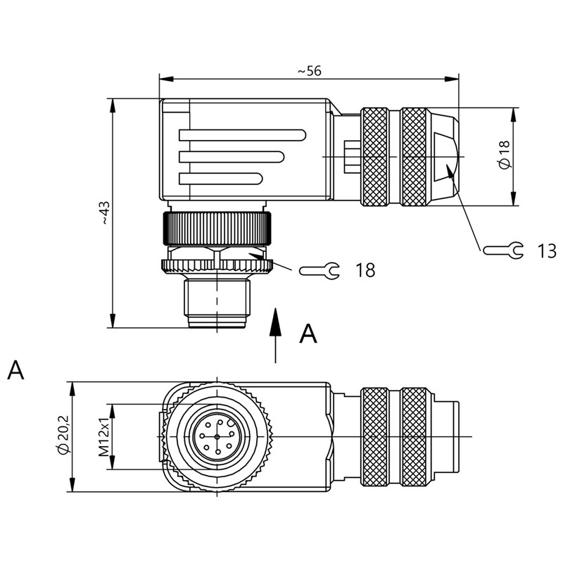• Raccordement A: Connecteur M12, mâle, coudé, 8 pôles, codé-A