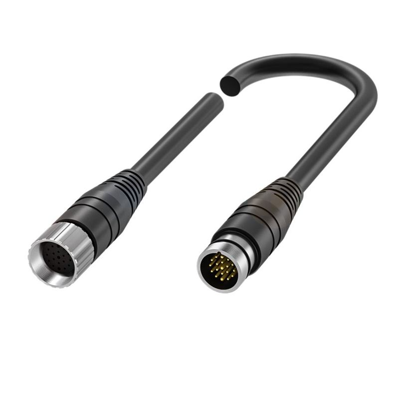 Connecteur / Câble de raccordement, Type de connecteur=M23x1 / M23x1, Raccordement A=Connecteur femelle M23, Raccordement B=Connecteur mâle M23, Matériau gaine de câble=PUR, Longueur de câble L [m]=5.00 m, Nombre de conducteurs=19, Caractéristiques supplémentaires=Compatible chaîne porte-câble, Visualisation d'état (BROCHE 4)=No / No