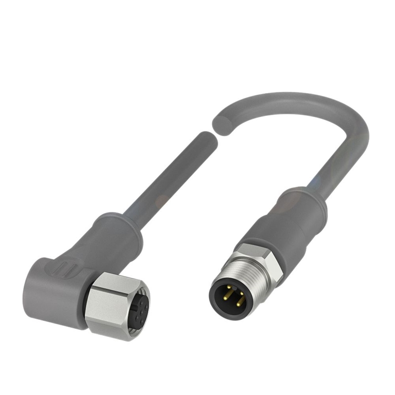 Connecteur / Câble de raccordement, Raccordement A: Connecteur M12x1 femelle, coudé, 5 pôles, codé-A, Raccordement B: Connecteur M12x1 mâle, droit, 4 pôles, codé-A, Câble: PUR blindé gris, 5 m, compatible chaînes porte-câbles, Nombre de conducteurs: 4, Température de câble, pose fixe: 50...80 °C, Température de câble, pose flexible: 25...80 °C, Tension d'emploi Ub: 250 VDC / 250 VAC, Courant nominal (40 °C): 4.0 A, Classe de protection: IP67/IP67, Homologation / conformité: CE, Ecolab, WEEE