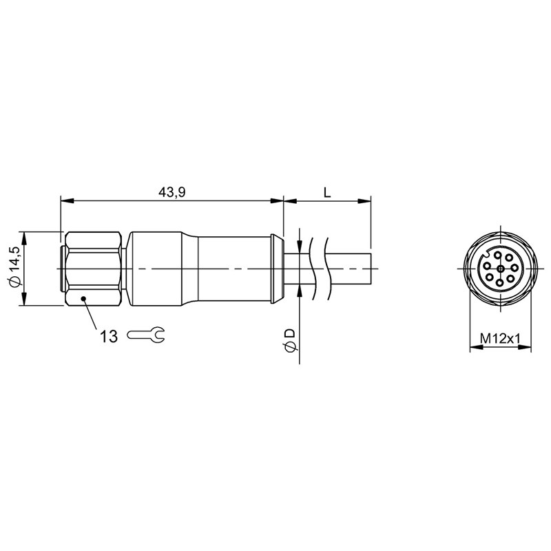 Connecteur / Câble de raccordement; Type: Câble de connexion, M12 x 1, Washdown; Type de signal: Capteurs / Actionneurs; Raccordement A: Connecteur M12, femelle droit, 8 pôles, codé-A; Raccordement B: Extrémité de câble libre; Câble: 5.00 m, TPE-V, 8 fils (8 x 0,25 mm²), gris; Blindage: Non blindé; Corps de poignée: PP; Matériau de l'écrou-raccord: Acier inoxydable (1.4404); Tension d'emploi Ub: 30 VDC / 30 VAC; Courant nominal (40 °C): 2.0 A; Classe de protection: IP67, IP69K; Température de câble, pose fixe: -50...105 °C; Température de câble, pose flexible: -25...105 °C; Homologation / conformité: CE, Ecolab, WEEE