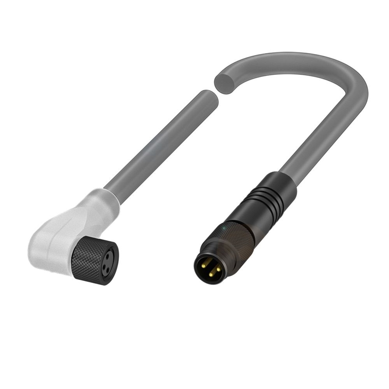 Connecteur / Câble de raccordement, Raccordement A: Connecteur M8x1, femelle, coudé, 3-pôles, codé A, Raccordement B: Connecteur M8x1, mâle, droit, 3-pôles, codé A, Témoin de mise sous tension: LED verte / non, Visualisation d'état (broche 4): LED jaune, Câble: TPE résistant aux étincelles de soudage gris, 2 m, Nombre de conducteurs: 3, Température de câble, pose fixe: -50...130 °C, Température de câble, pose flexible: -40...125 °C, Tension d'emploi Ub: 30 VDC, Courant nominal (40 °C): 4.0 A, Classe de protection: IP65/IP65, Homologation / conformité: CE, WEEE