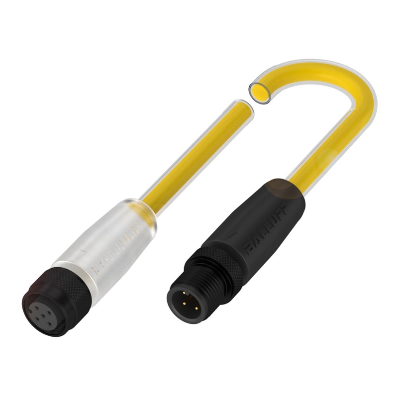 Connecteur / Câble de raccordement, Raccordement A: Connecteur M12x1, femelle, droit, 5-pôles, codé A, Raccordement B: Connecteur M12x1, mâle, 4-pôles, codé A, Témoin de mise sous tension: LED verte / non, Visualisation d'état: oui/non, Visualisation d'état (broche 2): LED blanche, Visualisation d'état (broche 4): LED jaune, Câble: TPE résistant aux étincelles de soudage jaune, 1 m, compatible chaîne porte-câble, Nombre de conducteurs: 4, Température de câble, pose fixe: -50...105 °C, Température de câble, pose flexible: -25...105 °C, Tension d'emploi Ub: 30 VDC, Courant nominal (40 °C): 4.0 A, Classe de protection: IP65/IP65, Homologation / conformité: CE, WEEE