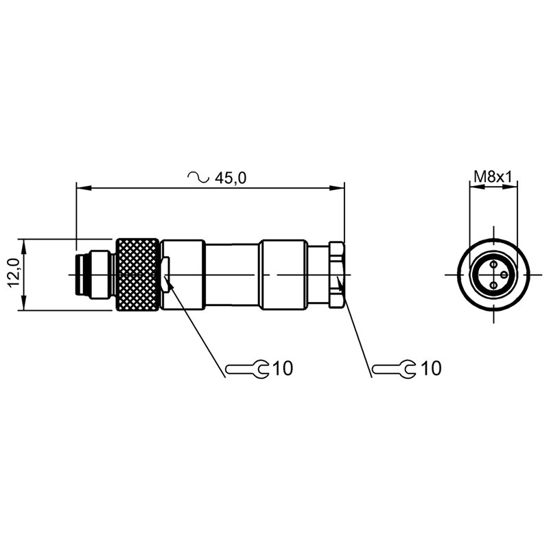 • Raccordement A: Connecteur M8, mâle, droit, 3 pôles, codé A
