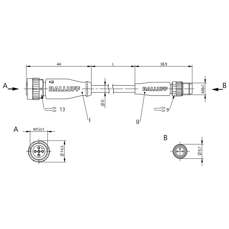 • Type: Câble de liaison M12 x 1 / M8 x 1, surmoulé / surmoulé