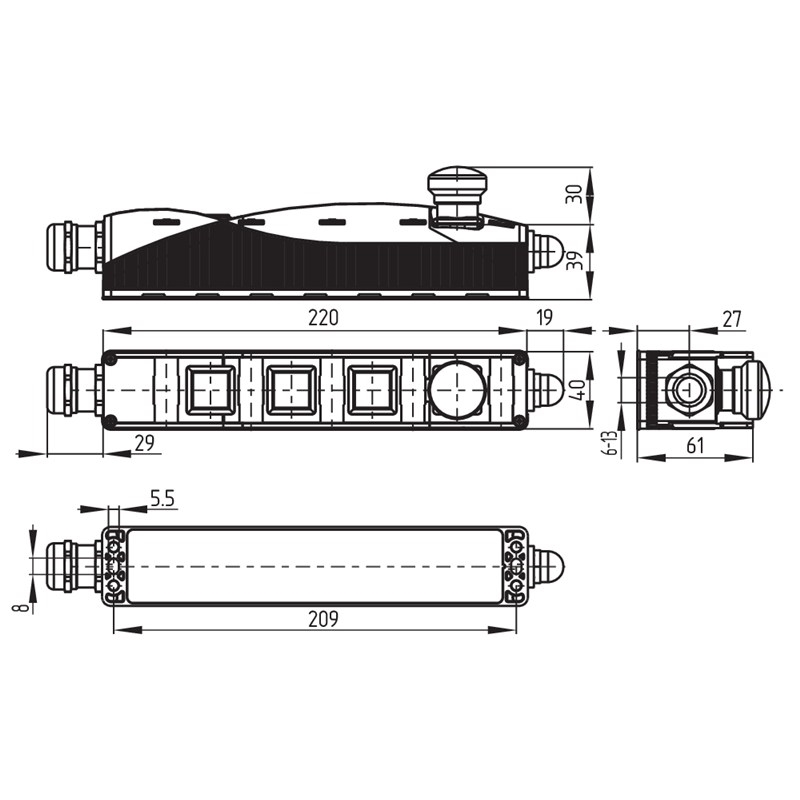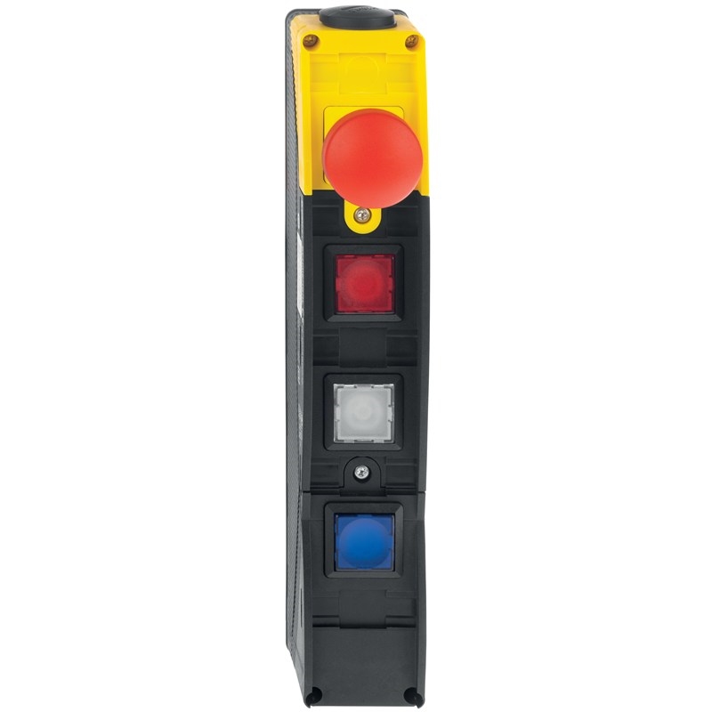 Boîtier de commande; Matériau du boîtier: Plastique, thermoplastique renforcé de fibres de verre, auto-extinguible; Position 1: Bouton coup-de-poing d'arrêt d'urgence; Position 2: LT-2875, Bouton-poussoir lumineux; Position 3: LT-2875, Bouton-poussoir lumineux; Position 4: LT-2875, Bouton-poussoir lumineux