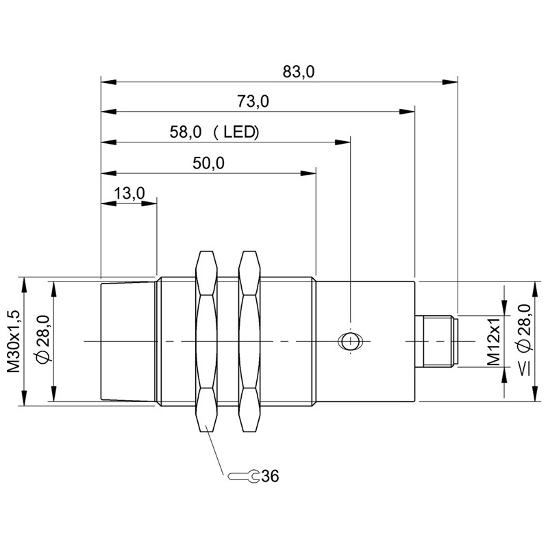 Capteur de proximité inductif; Format: Cylindrique fileté, M30 x 1.5; Version électrique: 4 fils DC; Portée Sn: 15.00 mm; Montage: Non noyable; Sortie de commutation: PNP; Type de commutation: Antivalente (NO+NF); Fréquence de commutation: 100 Hz; Raccordement: Connecteur; Diamètre: Ø 30 mm; Longueur totale du boîtier: 83 mm ; Longueur de filetage utile: 37 mm ; Matériau du boîtier: Laiton nickelé; Face sensible, matériau: PA 12 ; Tension d'emploi Ub: 10...30 VDC; Température ambiante: -25...70 °C; Classe de protection: IP68; Homologation / conformité: CE, UKCA, cULus, WEEE