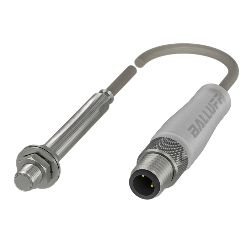 Capteur inductif, Dimensions: Ø 5 x 27 mm, Modèle: M5x0,5, Montage: noyable, Portée: 0,8 mm, Sortie de commutation: PNP à fermeture (NO), Fréquence de commutation: 1,5 kHz, Matériau du boîtier: Acier inoxydable (1.4104), Face sensible, matériau: Céramique, Raccordement: Câble avec connecteur, M8x1, 1 m, Silicone, Tension d'emploi Ub: 10...30 VDC, Température ambiante: 0...135 °C, Classe de protection: IP67, Homologation / conformité: CE, UKCA, cULus, WEEE