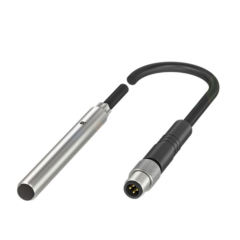 Inductive sensor, Ø 5 x 42 mm, Cable with connector, Normally closed (NC), Rated operating distance Sn=0.8 mm, for flush mounting, 10 bar, oil pressure rated, Housing material=Stainless steel, Sensing surface material=Ceramic