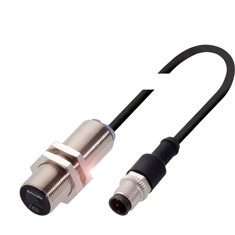 Capteur inductif, Dimensions: Ø 18 x 55 mm, Modèle: M18x1, Montage: noyable, Portée: 8 mm, Sortie de commutation: PNP à fermeture (NO), Fréquence de commutation: 1300 Hz, Matériau du boîtier: Laiton, revêtement sans nickel, Face sensible, matériau: PBT, Raccordement A: Câble avec connecteur, connecteur M12x1, mâle, 3 pôles, 0,30 m, PUR, Tension d'emploi Ub: 10...30 VDC, Température ambiante: -40...85 °C, Classe de protection: IP68, Homologation / conformité: cULus, CE, UKCA, WEEE
