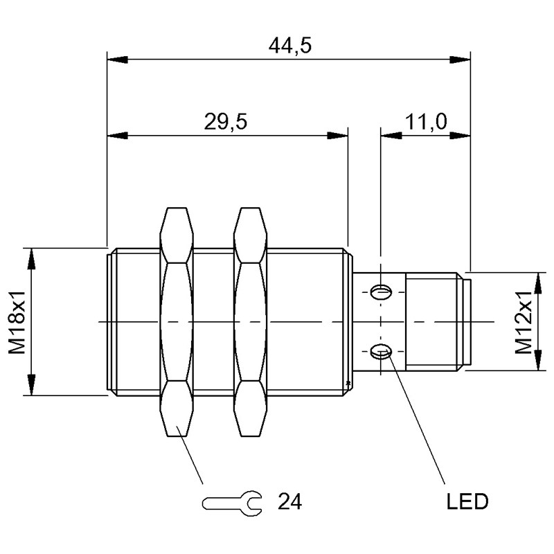 Capteur de proximité inductif; Format: Cylindrique fileté, M18 x 1; Version électrique: 3 fils DC; Portée Sn: 5.00 mm; Montage: Noyable; Sortie de commutation: PNP; Type de commutation: Contact à fermeture (NO); Fréquence de commutation: 1000 Hz; Interface de communication: -; Raccordement: Connecteur mâle M12 4 pôles; Tension d'alimentation: 10-30Vdc; Diamètre: Ø 30 mm; Longueur totale du boîtier: 44,5 mm; Longueur de filetage utile: 29,5 mm; Matériau du boîtier: Laiton; Classe de protection: IP67 (CEI 60529); Température ambiante: -25...70 °C
