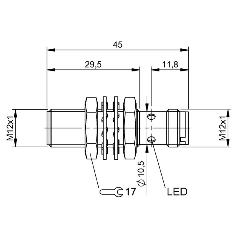 Capteur de proximité inductif; Format: Cylindrique fileté, M12 x 1; Version électrique: 3 fils DC; Portée Sn: 6.00 mm; Montage: Quasi noyé; Sortie de commutation: NPN; Type de commutation: Contact à fermeture (NO); Fréquence de commutation: 1000 Hz; Interface de communication: -; Raccordement: Connecteur mâle M12 4 pôles 3 fils; Tension d'alimentation: 10-30Vdc; Diamètre: Ø 12 mm; Longueur totale du boîtier: 45 mm; Longueur de filetage utile: 29.5 mm; Matériau du boîtier: Laiton non nickelé; Face sensible, matériau: PBT; Classe de protection: IP68; Température ambiante: -25...85 °C