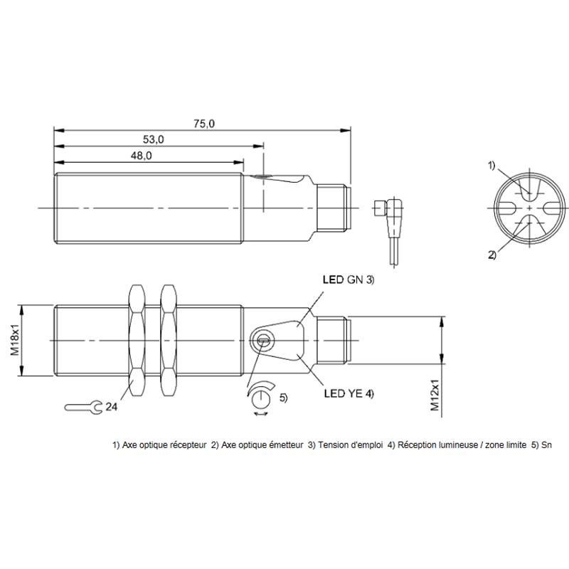 Amplificateur pour fibres optiques; Format: Cylindrique fileté, M18x1; Portée: Dépend de la fibre optique; Réglage: Potentiomètre 270°; Source d'émission: LED, Lumière rouge; Sortie de commutation: PNP (2x); Type de commutation: Contact à fermeture / ouverture (NO/NF); Fréquence de commutation: 1000 Hz; Interface de communication: -; Mode de raccordement: Connecteur mâle M12 4 pôles; Tension d'alimentation: 10-30Vdc; Dimensions: Ø 18 x 75 mm; Matériau du boîtier: Laiton nickelé; Classe de protection: IP67; Température ambiante: -5…55 °C