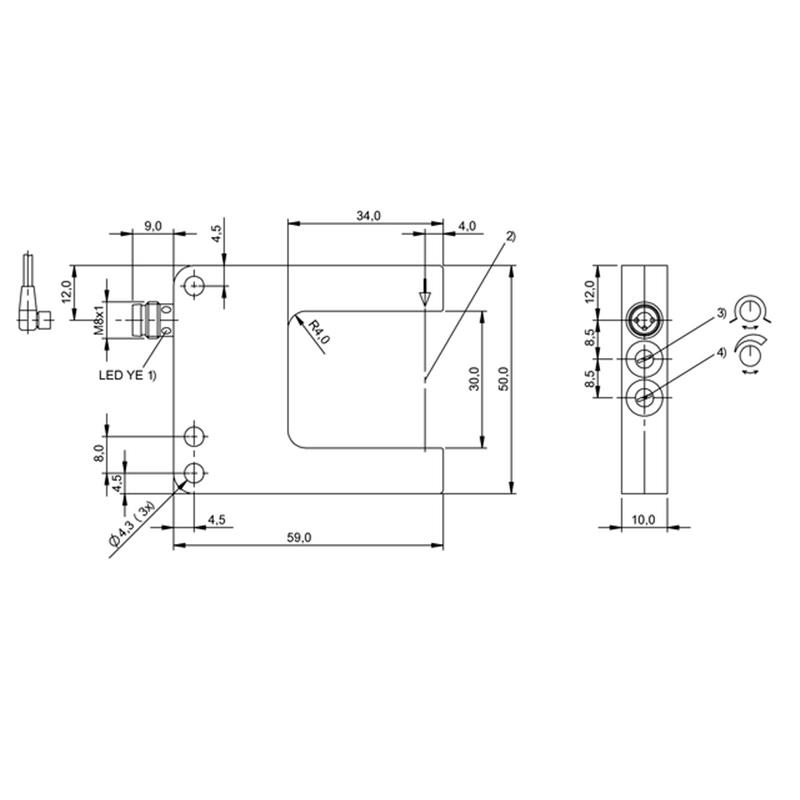 Fourche optique; Format: Fourche en U; Principe du capteur: Barrière; Principe de détection: Émetteur-récepteur; Ecartement de la fourche: 30 mm; Profondeur de la fourche: 30 mm (34 mm); Réglage: Potentiomètre, 270°; Source d'émission: LED, Lumière rouge; Taille du spot lumineux: Ø 1.2 mm, Sortie lumière; Sortie de commutation: PNP (x1); Type de commutation: Contact à fermeture/ouverture (NO/NF); Mode de commutation: Commutation claire/sombre; Fréquence de commutation: 1500 Hz; Interface de communication: -; Raccordement: Connecteur mâle M8, 3 pôles; Tension d'alimentation: 10-30Vdc; Dimensions: 10 x 68 x 50 mm; Matériau boîtier: Zinc, moulé sous pression; Indice de protection: IP67 (CEI 60529); Température ambiante: -10…60 °C; Homologation / conformité: cULus, CE, UKCA, WEEE; Série: A